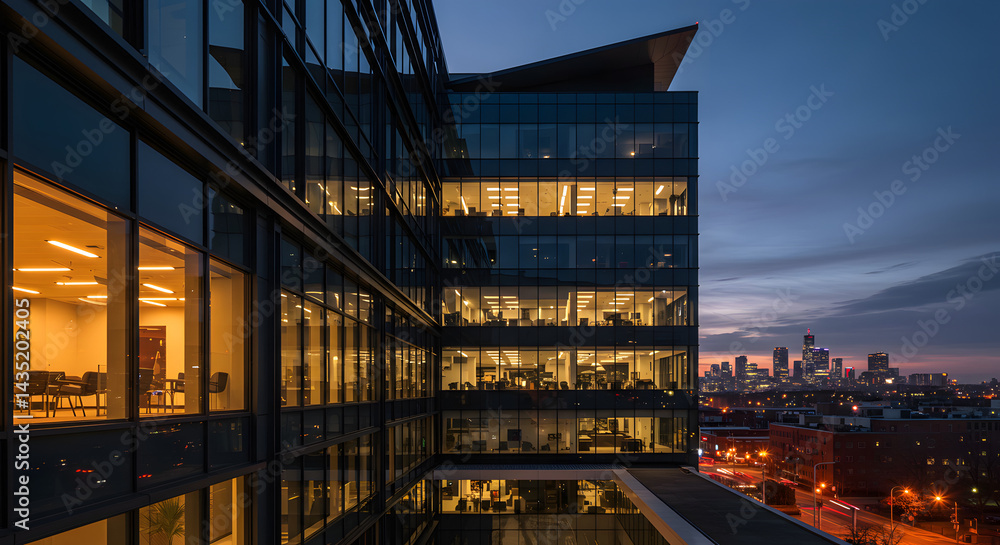 Akoestisch textielframe (Artframe) Modern glass office building at twilight, illuminated interior visible through large windows, city skyline in background. Warm interior lighting contrasts with cool dusk sky. #1435202405