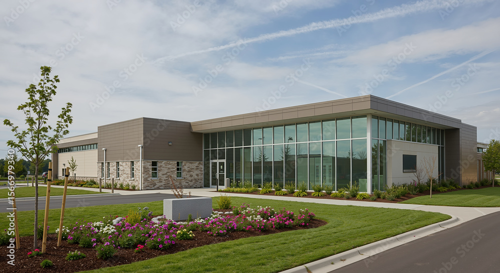 Akoestisch textielframe (Artframe) Modern glass office building with large windows reflecting blue sky clouds contemporary architecture. Corporate business headquarters professional workplace environment. Commercial real estate banner #1566979340