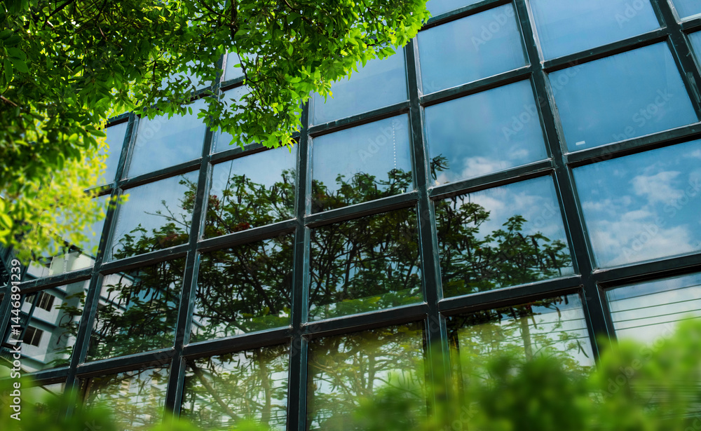 Akoestisch textielframe (Artframe) Modern glass office with big trees around to reduce heat in the building. Eco-friendly building. Sustainability concept #1446891239