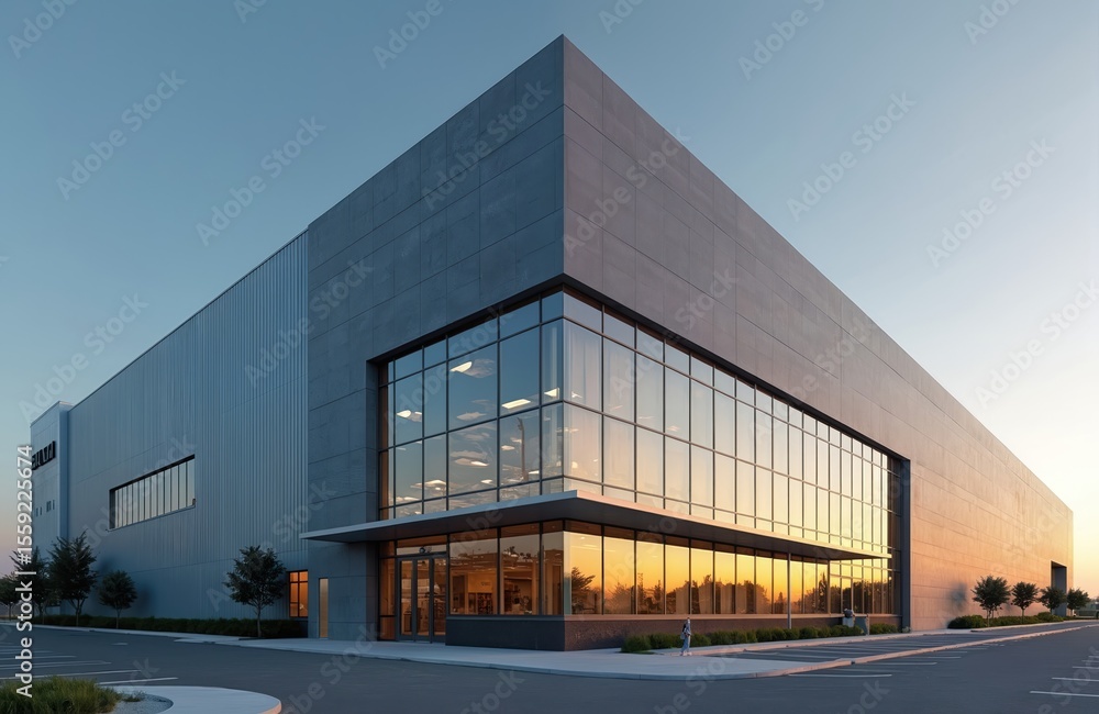 Akoestisch textielframe (Artframe) Modern office building with glass facade reflecting sunset sky. Corporate exterior design, large windows, commercial property in urban downtown area. Construction, business work, real estate concept. #1559225674