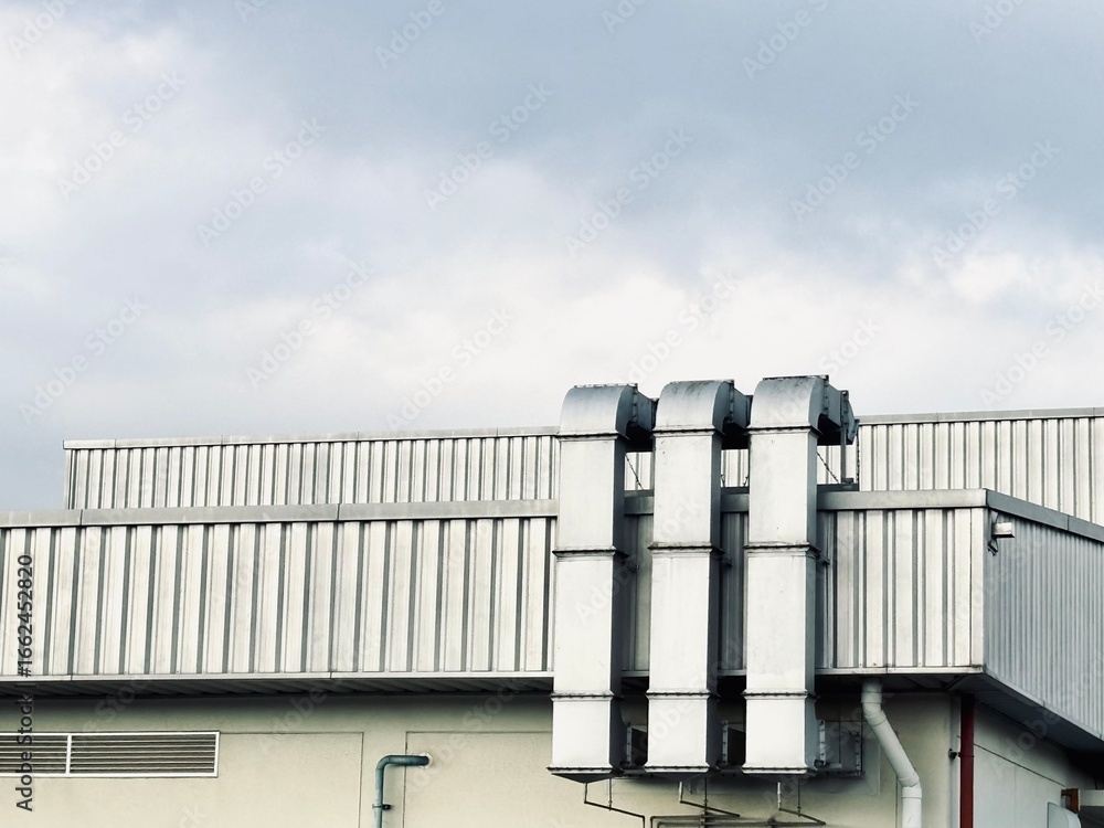 Akoestisch textielframe (Artframe) The image shows the top of a modern factory building with multiple large, metallic ventilation ducts rising against a cloudy sky. #1662452820