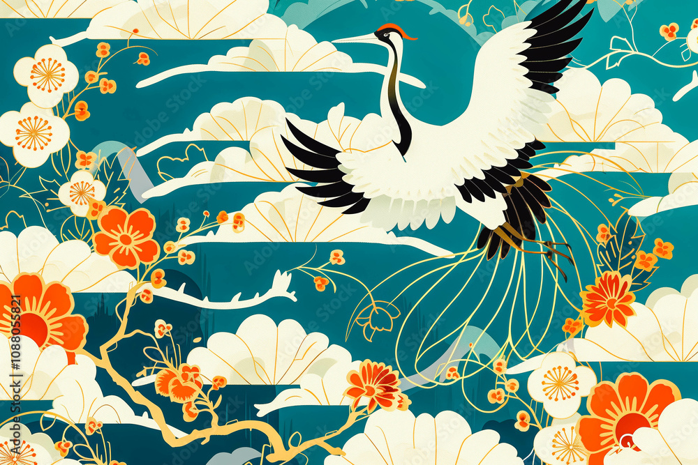Textielframe (Artframe) Traditional japanese kimono textile pattern style with crane element