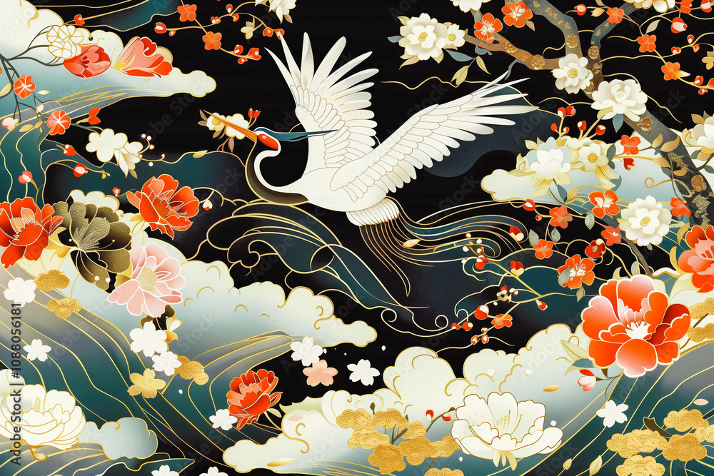 Textielframe (Artframe) Traditional japanese kimono textile pattern style with crane element