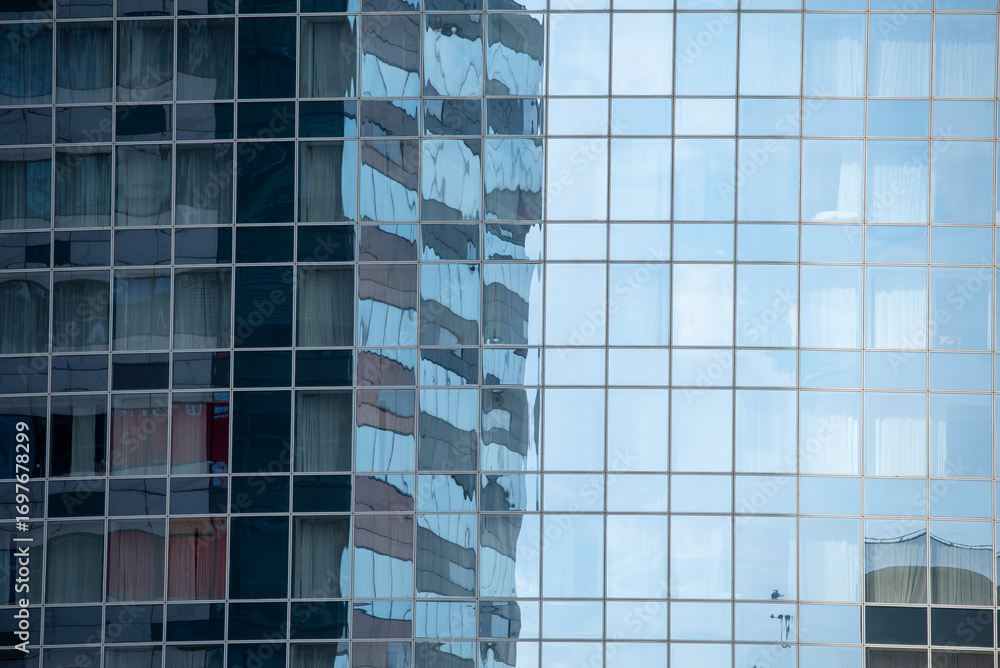 Akoestisch textielframe (Artframe) walls and empty windows of a modern building on a big city street without people #1697678299
