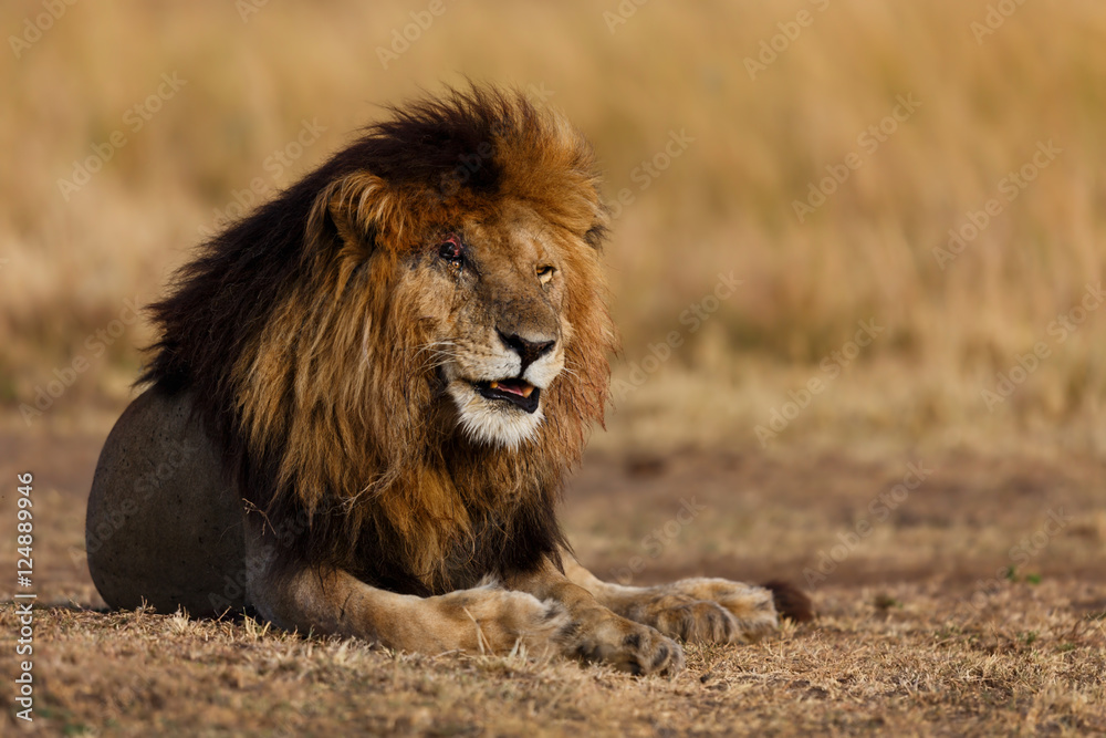 Textielposter Big Lion Scarface, een van de vier musketiers, in Masai Mara, Kenia