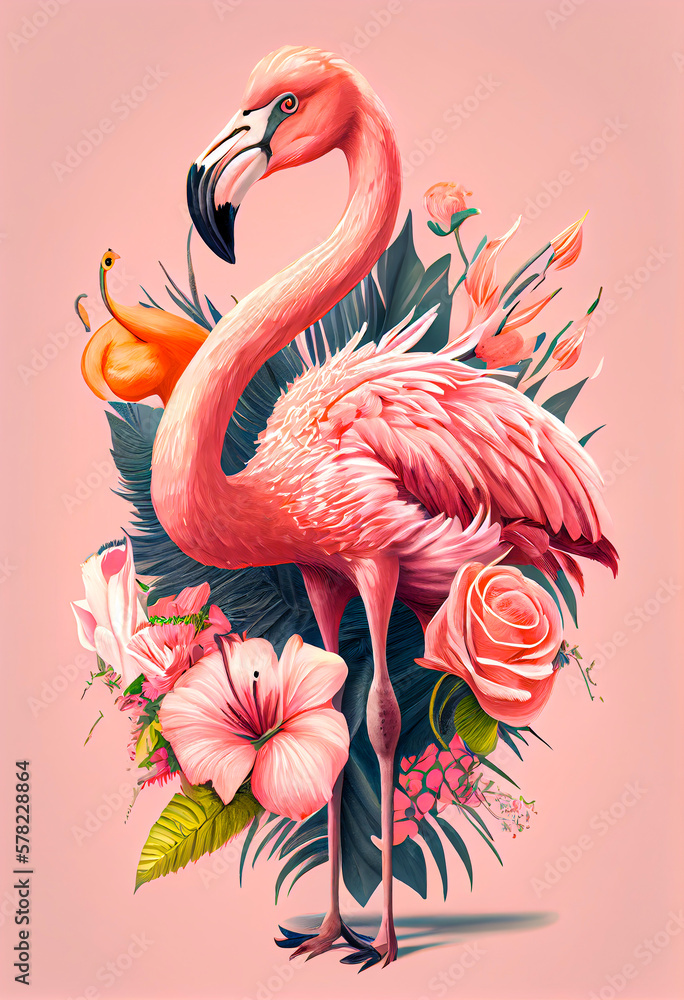 Textielposter Exotisch zomerroze dier, flamingo bedekt met verse lentebloemen. Tropische achtergrond. Abstract dierenconcept. Illustratie, generatieve AI. #578228864