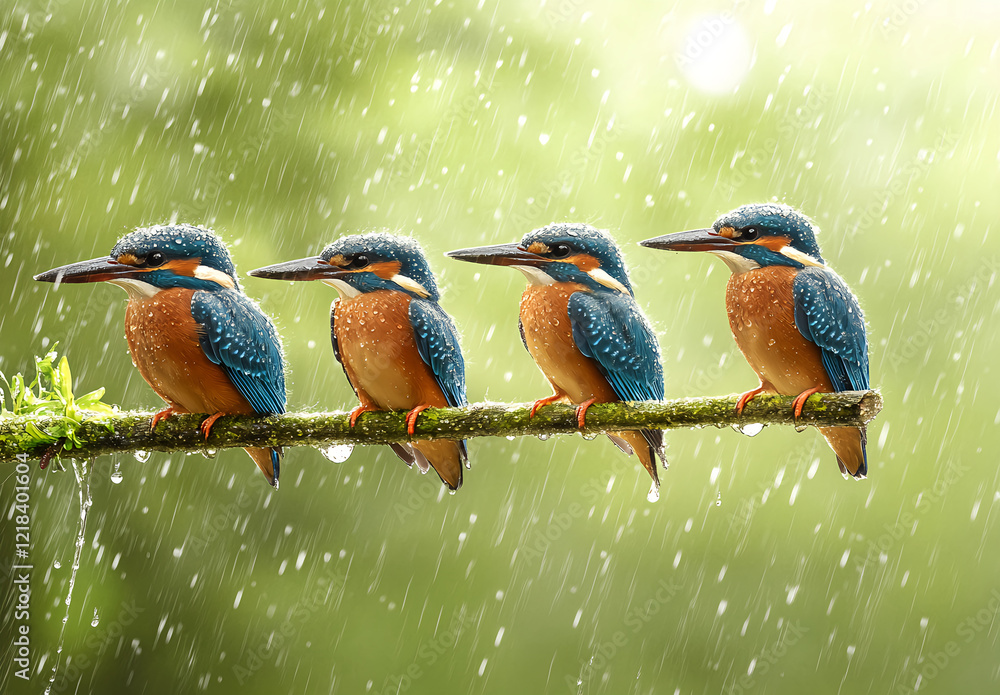 Textielposter A photorealistic painting of kingfishers perched on a branch, set against a green background with soft lighting and raindrops. #1218401604