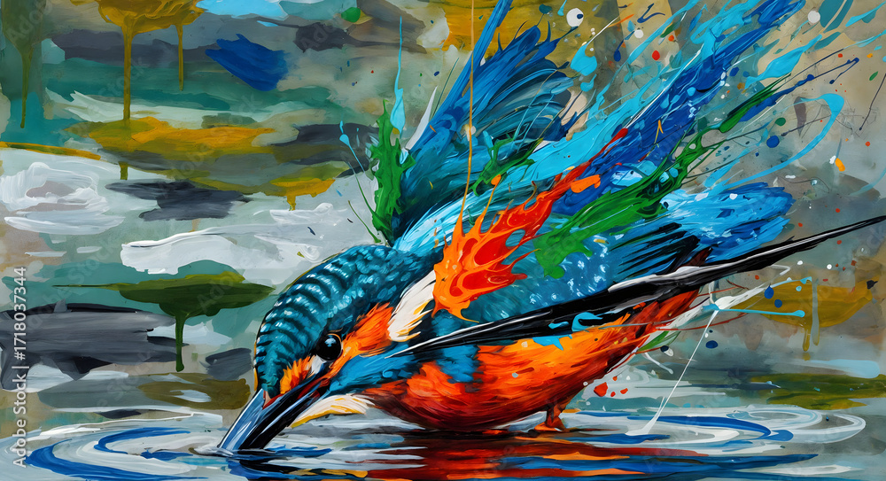 Textielposter Colorful kingfisher bird diving into water with abstract paint splashes #1718037344
