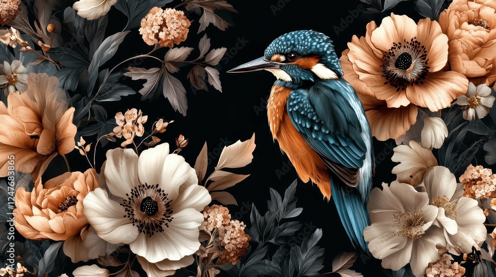 Textielposter Detailed floral pattern with a bird in the center, featuring various shades of beige, brown, and gray flowers, leaves, and delicate textures on a #1247683865