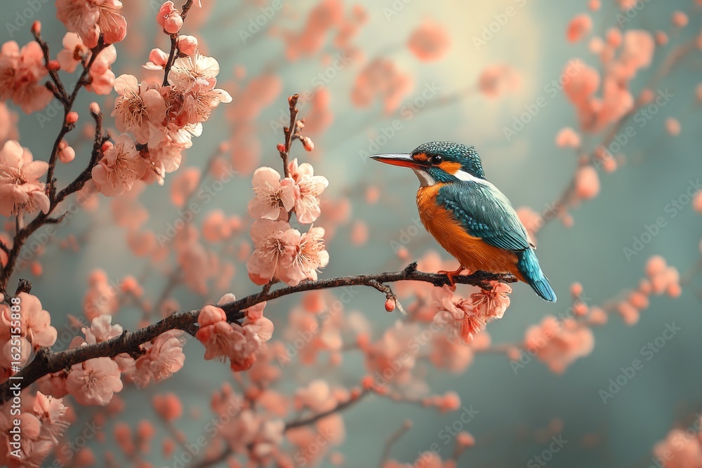 Textielposter Kingfisher on Peach Blossom Branch - A vibrant kingfisher bird perched on a delicate peach blossom branch, showcasing beautiful spring colors #1625155888