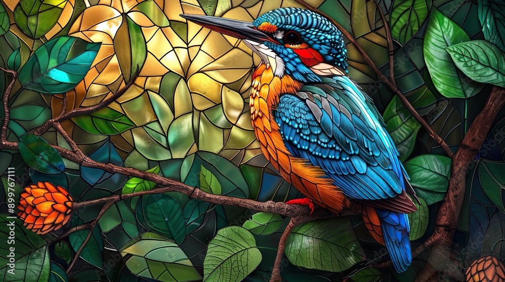 Textielposter Stained glass depiction of a colorful kingfisher with bright blue and orange feathers. #899767111