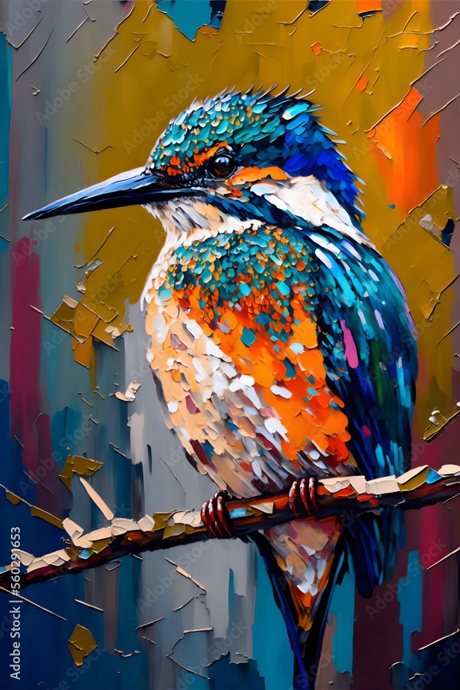 Textielposter This realistic painting illustration, depicts a hummingbird perched on a branch. The vibrant colors and intricate details make it come to life, giving the viewer a sense of serenity and beauty #560291653