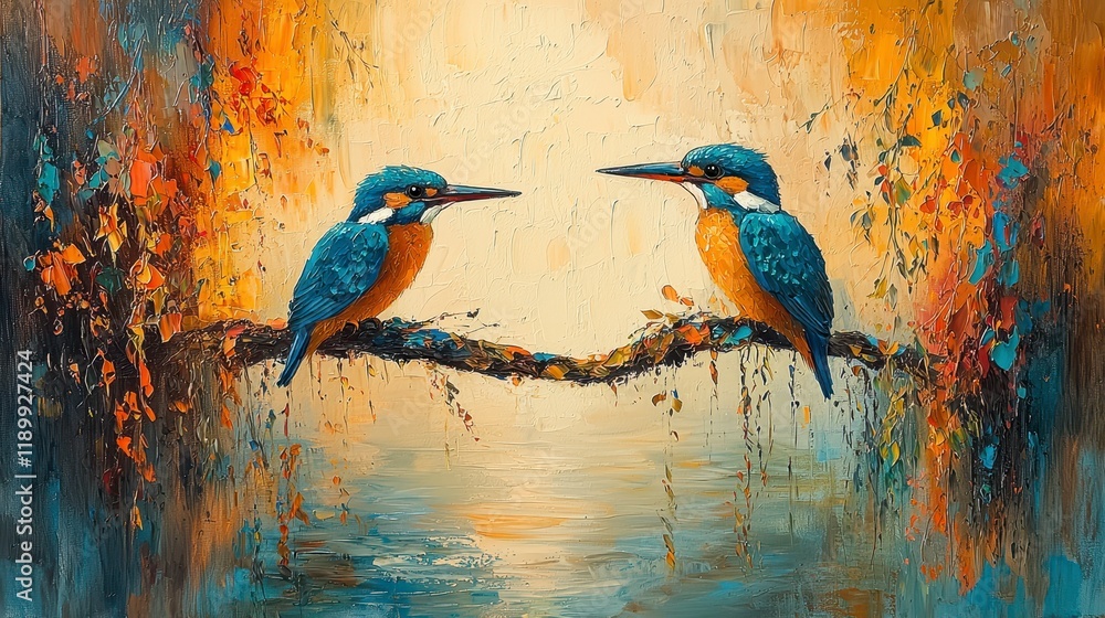 Textielposter Two kingfishers perched on a branch over water, painted in vibrant autumnal colors. #1189927424