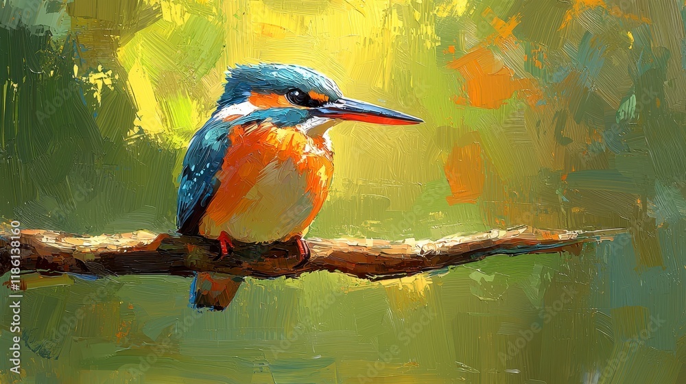 Textielposter Vibrant kingfisher perched on a branch, painted in an impressionistic style. #1186138160