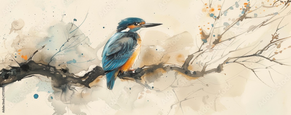 Textielposter Watercolor painting of a kingfisher on a branch #773008511
