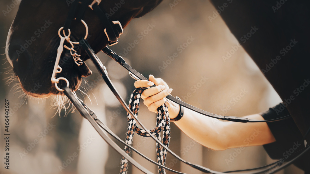 Wandkleed Een paardenfokker in een zwart T-shirt houdt een zwart, sterk paard vast met een hoofdstel op zijn snuit als halstertouw. Paardensport. Paardrijden.