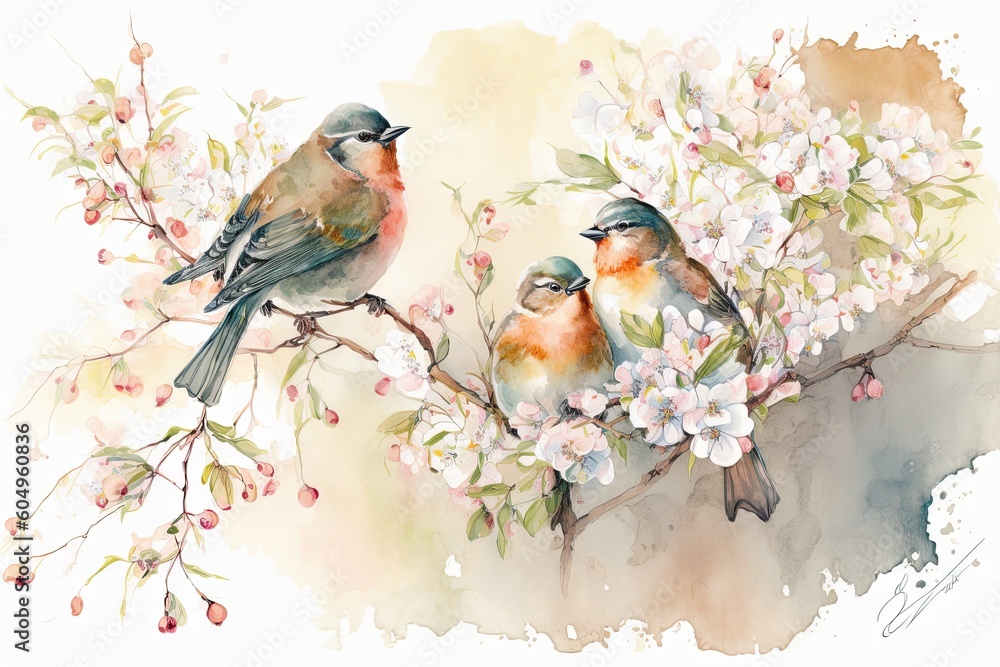 Wandkleed Kleurrijke vogels op stok bloeiende boom met bloem in artistiek aquarelontwerp. Concept van schildertechniek geïsoleerd op een witte achtergrond in canvas. Glorieuze generatieve AI. #604960836