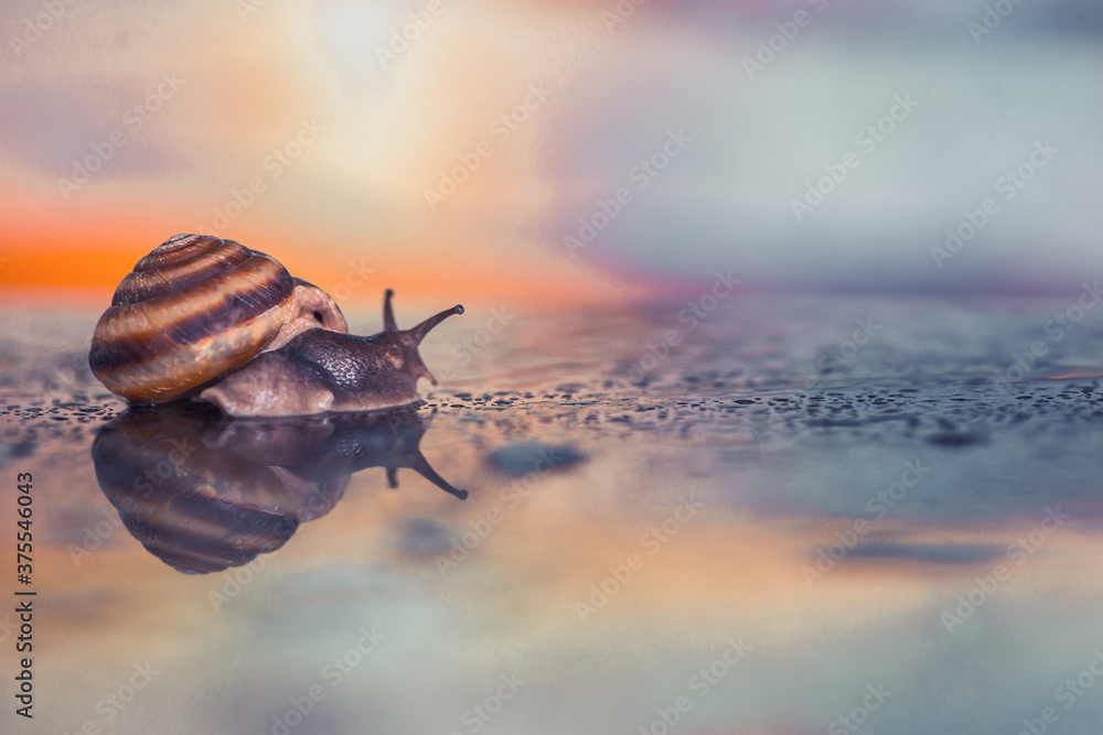 Wandkleed close-up van een bruine druivenslak. bruine slak op de achtergrond van de zee-zonsondergang. slak op de zee. bruine schelp aan de kust. slak kruipen langs de kust bij zonsondergang. slak tegen de instelling s #375546043