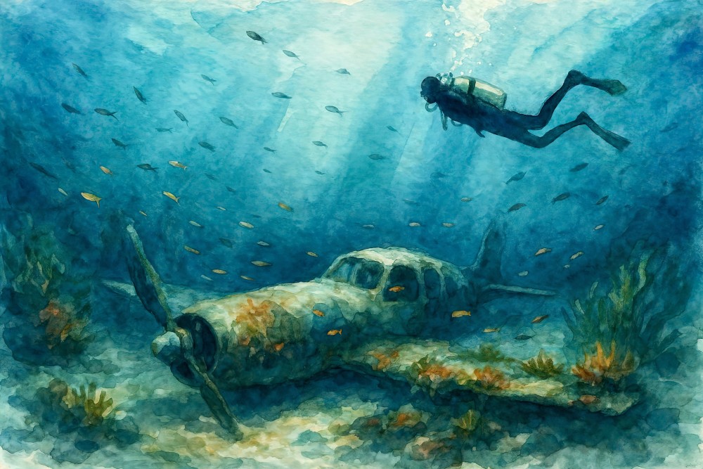 Bestel Scubaduiker boven oud vliegtuigwrak in zee van Natalie Bruns op aluminium, muurcirkel, canvas, wandkleed, behang, spatwand, textielframe of een andere creatieve wanddecoratie. Kies je product, materiaal en formaat en ontwerp je unieke print!