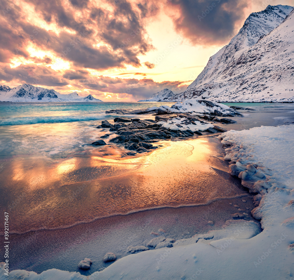 Wandkleed Kleurrijke de winterzonsondergang op Lofoten-eilanden, Noorwegen, Europa. Adembenemende ochtendscène van populaire toeristenbestemming - Skagsanden-strand, Flaktadoya-eiland. Ongerept winterlandschap. #392171467